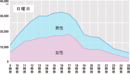 男女比はほぼ同率。平日に比べ休日は女性が多くなります。